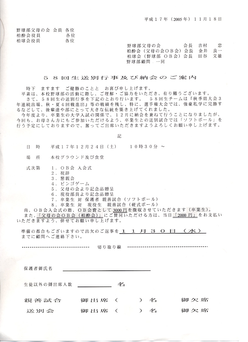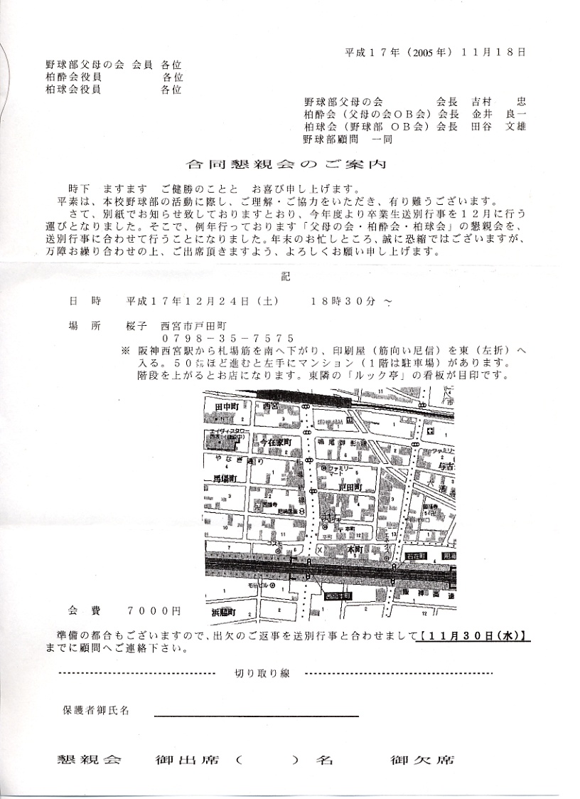 父母の会主催3年慰労会のご案内(2005.08.10)